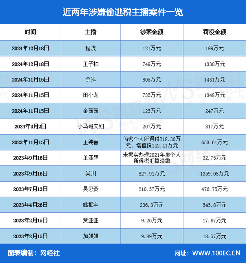 近期,偷逃税案件不斷爆出,涉及明星網紅、帶貨主播等。如網絡主播程虎涉嫌偷税被罰沒199萬元,“柏公子”偷税749萬元被罰沒1330萬元,主播餘洋等三人偷逃税被罰3026萬。據網經社不完全統計,今年3月,網紅主播小馬哥夫婦偷税被罰317萬;去年,帶貨主播王純善涉嫌偷逃税款360萬;賈亞亞、加嬋嬋涉嫌偷逃税被處罰;2022年,帶貨主播平榮偷逃税被追繳並罰6200萬元,直播帶貨主播範思峯偷逃税被罰649.5萬;更早以前,薇婭、雪梨、林珊珊也曾因偷逃税被罰。