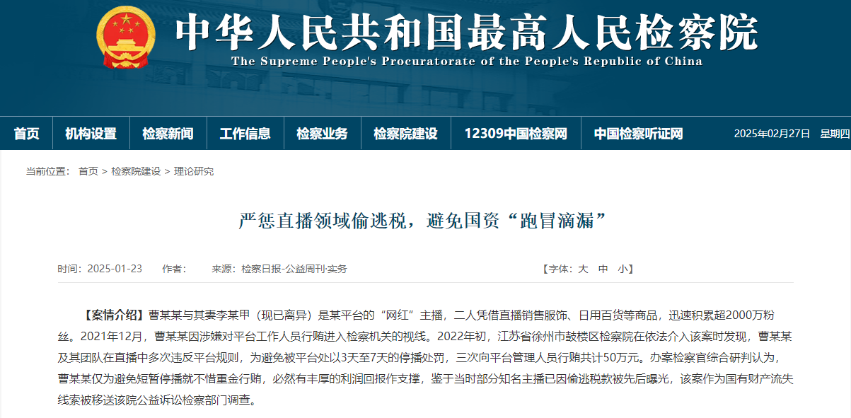 曹某某與其妻李某甲(現已離異)是某平台的“網紅”主播,二人憑藉直播銷售服飾、日用百貨等商品,迅速積累超2000萬粉絲。2021年12月,曹某某因涉嫌對平台工作人員行賄進入檢察機關的視線。2022年初,江蘇省徐州市鼓樓區檢察院在依法介入該案時發現,曹某某及其團隊在直播中多次違反平台規則,為避免被平台處以3天至7天的停播處罰,三次向平台管理人員行賄共計50萬元。辦案檢察官綜合研判認為,曹某某僅為避免短暫停播就不惜重金行賄,必然有豐厚的利潤回報作支撐,鑑於當時部分知名主播已因偷逃税款被先後曝光,該案作為國有財產流失線索被移送該院公益訴訟檢察部門調查。