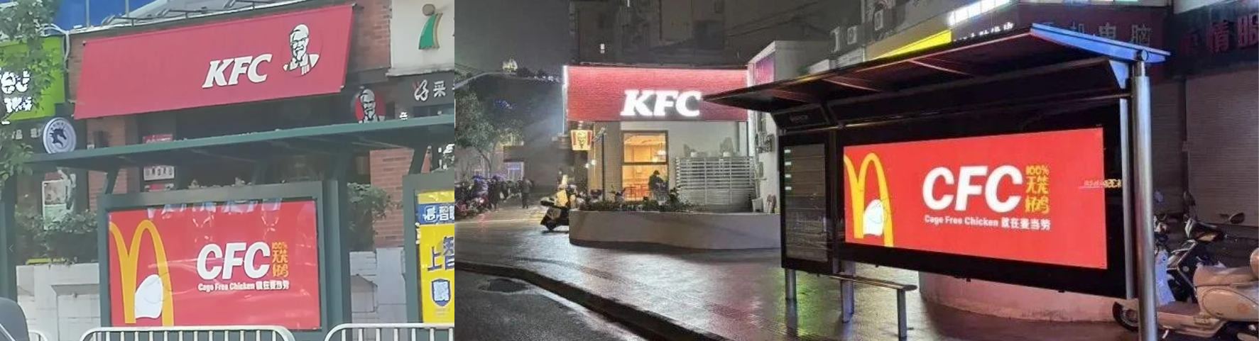 2月中旬,麥當勞為了宣傳自家的“無籠養殖雞”(Cage Free Chicken),投放了一波線下廣告,但紅底白字、斜體字樣「CFC」的高仿感廣告牌,怎麼看怎麼眼熟,而且很多廣告牌的投放位置都位於肯德基門店附近,很難説不是故意的。部分廣告直接標註“100%無籠好雞,就在麥當勞”,讓人不禁聯想到多年前關於某品牌“六個翅膀變異雞”的江湖傳聞,一股子碰瓷味兒。