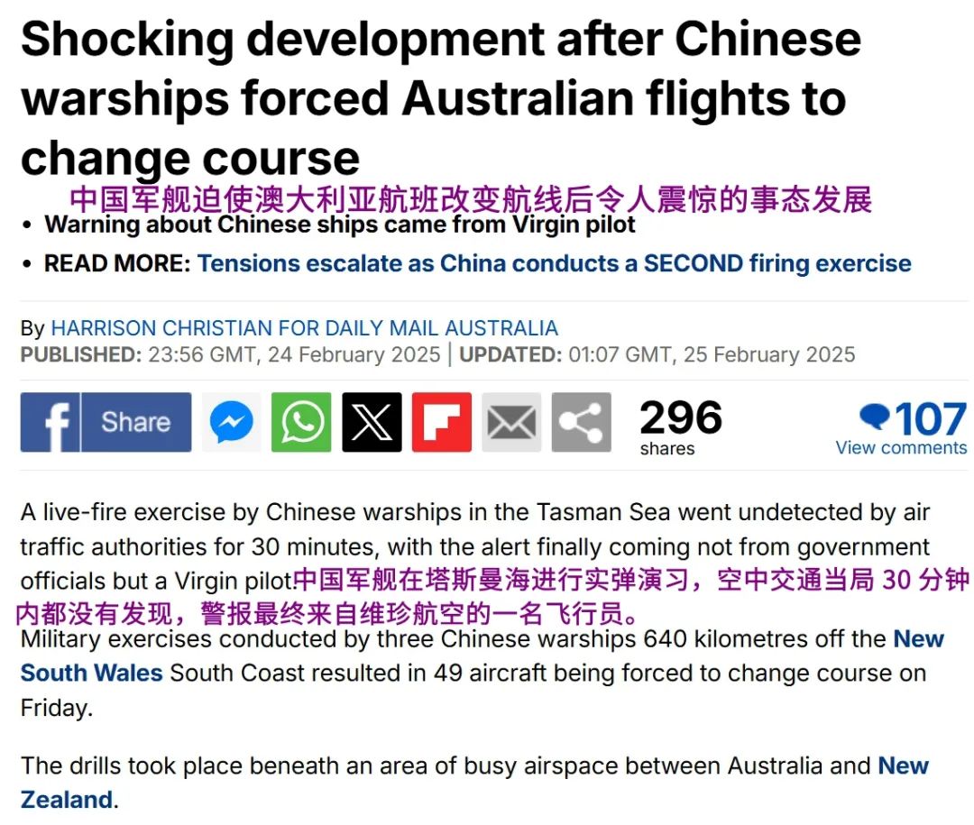至於澳大利亞國防部?對中國海軍正在進行實彈射擊訓練也一無所知,甚至就在得到了澳大利亞民航空管部門的通報後,澳大利亞國防部依然嘴硬説,沒有接到中國海軍進行實彈射擊的報告……一直等到澳大利亞媒體把這來龍去脈全抖摟出來之後,澳大利亞國防部才緊急改口,説他們對中國海軍進行實彈射擊的信息知情。