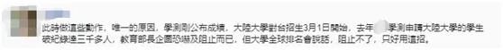 還有網友分析,“此時做這些動作,唯一的原因是,學測剛公佈成績,大陸大學對台招生3月1日開始,去年學測申請大陸大學的學生破紀錄達3000多人,教育部門負責人企圖恐嚇及阻止而已,但大學全球排名會説話,阻止不了,只好用這招。”