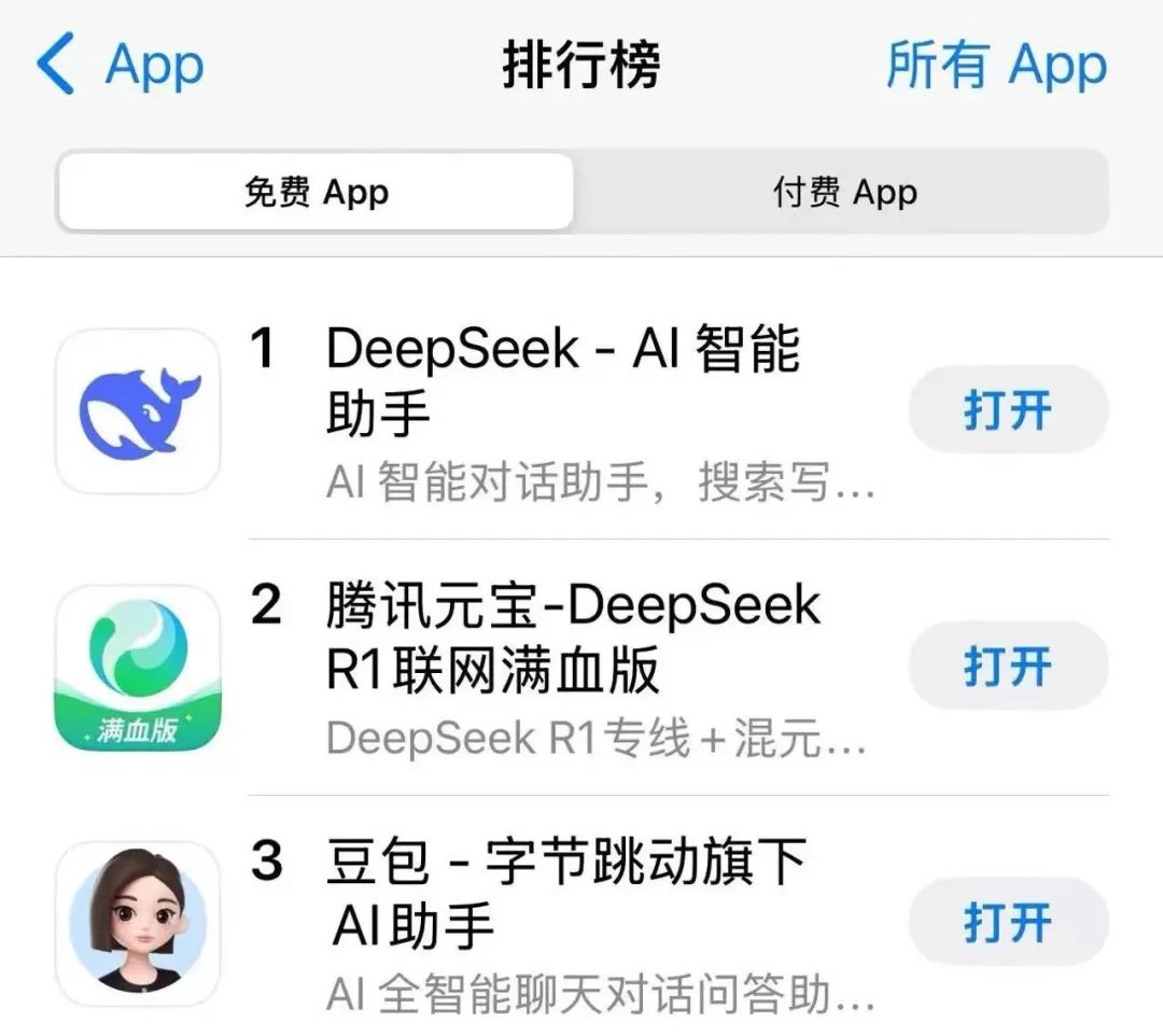 然而隨着DeepSeek真正讓AI開始進入公眾視野,騰訊近期也開始發力推廣上線將近一年的元寶,無論是整個騰訊生態圈廣告位,還是各路社區的站內banner,都能看到騰訊元寶呼喚用户的身影,再加上得益於能提供滿血版DeepSeek服務後表現強勁,過去一兩週內,AppStore免費App榜升至第二位,下載量反超豆包,成為當下最火爆的AI產品。