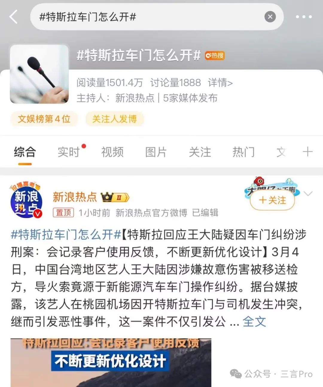 消息曝出來後,“王大陸因不會開特斯拉車門捶窗"登上了文娛榜熱搜第一。