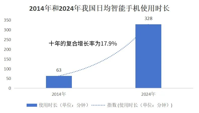 僅以手機為例,我國2014年至2024年,我國日均智能手機使用時長從63分鐘增長到328分鐘,十年的複合增長率為17.9%。