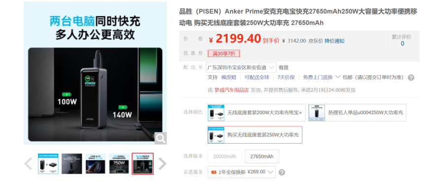 像“Anker Prime 250W 27650mAh充電寶”,售價為1199元,加上磁吸充電底座要2000元出頭。