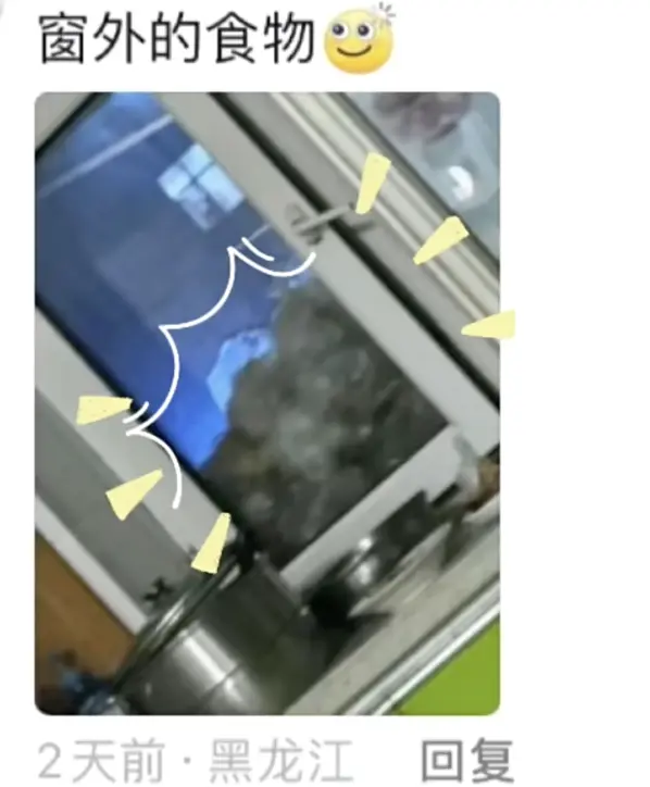 有網友分享自己家裏窗外食物堆積的情況,照片充滿疏離感,跟在阿爾卑斯山的小木屋裏拍的似的。