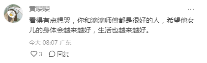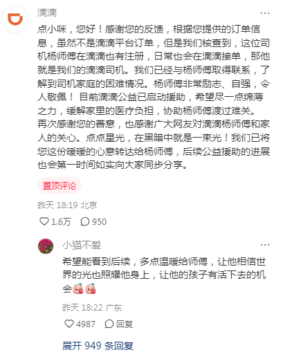 滴滴官方賬號在這篇貼文的評論區現身,稱他們找到了這位司機,也證實了他的家庭情況,表示會協助司機師傅渡過難關↓