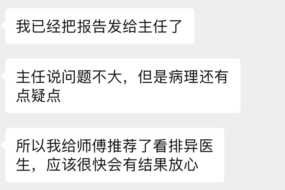 後來,發帖的博主表示,這位善良的網友和司機已經取得了聯繫,把孩子的報告給主任看了,併為司機師傅推薦了排異醫生。