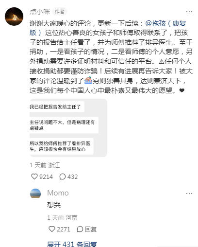 而對於網友紛紛想要捐助一事,博主表示:另外捐助需要許多證明材料和可信任的平台。⚠️任何個人接收捐助都要謹防詐騙!後續有進展再告訴大家!被大家的評論温暖到了窮則獨善其身,達則兼濟天下,這是我們每個中國人心中最樸素又最偉大的願望。❤️