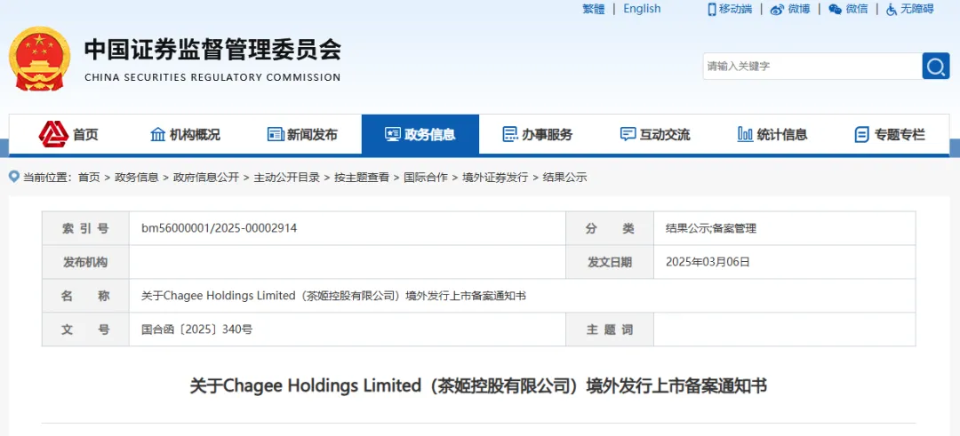 中國證監會網站發佈關於Chagee Holdings Limited(茶姬控股有限公司)境外發行上市備案通知書。霸王茶姬將計劃發行不超過64,731,929股普通股並在美國納斯達克證券交易所或紐約證券交易所上市。自備案通知書出具之日起至本次境外發行上市結束前,霸王茶姬如發生重大事項,應根據境內企業境外發行上市有關規定,通過中國證監會備案管理信息系統報告。霸王茶姬完成境外發行上市後15個工作日內,應通過中國證監會備案管理信息系統報告發行上市情況。公司在境外發行上市過程中應嚴格遵守境內外有關法律、法規和規則。霸王茶姬自本備案通知書出具之日起12個月內未完成境外發行上市,擬繼續推進的,應當更新備案材料。