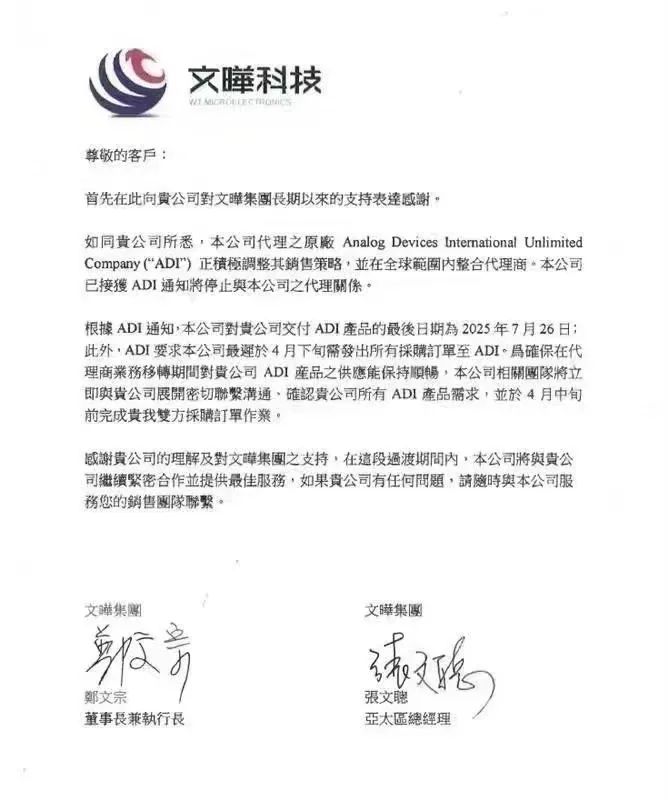 傳聞模擬芯片大廠ADI要取消芯片分銷商文曄(WT)代理權,根據網傳的通知函,文曄發佈聲明稱,ADI正在調整銷售策略,並在全球範圍內整合代理商,文曄已接獲ADI通知,將停止與文曄的代理關係。截至發稿時間,文曄與ADI雙方仍未公開對這一網傳事件作出回應。