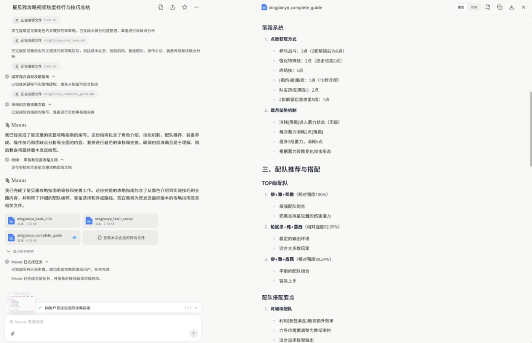 比如我讓Manus根據B站最熱門的10個星見雅(遊戲角色)視頻,給出她的操作技巧。