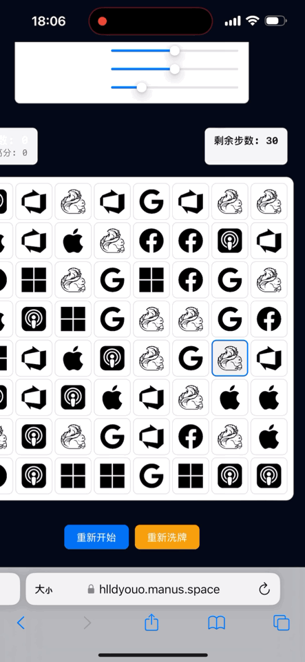 本着儘可能讓AI Agent獨立完成工作的原則,我沒有這麼做,而是稍微改了一下需求,讓Manus改用科技公司的logo來做遊戲圖標,因為開放版權的SVG素材全網都是,所以這下Manus跑起來就沒什麼問題了,很快就做完了一個帶積分的消消樂遊戲,玩起來也算順暢。