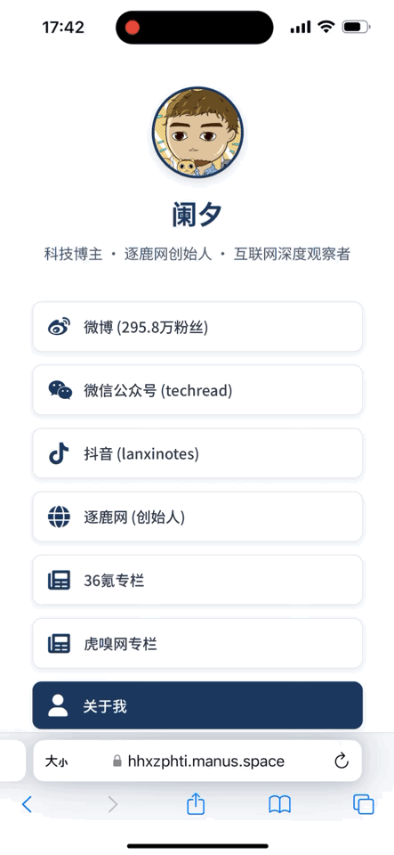 首先我讓它幫我做一張linktree風格的個人主頁,Manus把這個任務拆成了8個步驟,先在全網蒐集我的資料信息,包括我在各個平台的鏈接以及代表作,然後基於linktree的設計風格開始編寫網頁代碼,半個小時之後,它交付了這麼一個作品給我。
