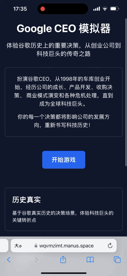 用了差不多一個小時,Manus把谷歌CEO模擬器的網頁遊戲開發好了,完成度很高,點擊開始遊戲,還會讓你自選難度,接着就會面對谷歌發展史上的每一次轉變節點,你的選擇會決定公司資源的變化,並影響最終的遊戲結局。