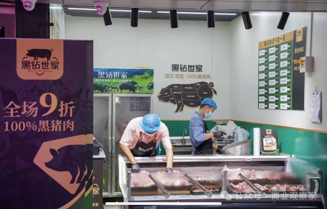 在2024年,叮咚買菜下面的事業部,比如肉品事業部,也將叮咚買菜做的川藏黑豬自有品牌——黑鑽世家,進行了線下連鎖業態的開發,在上海開出了幾家店。