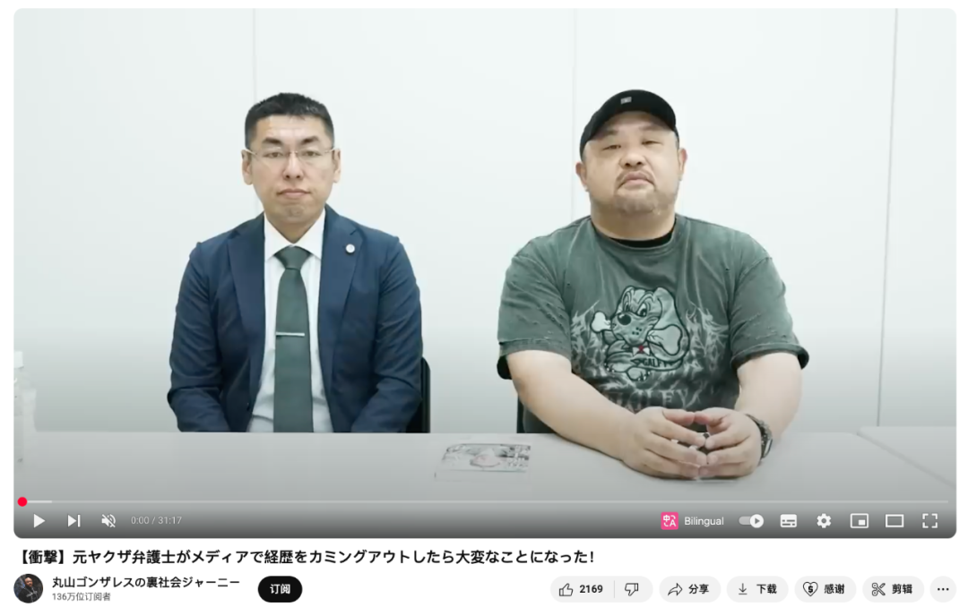 而在做律師的第8年,諸橋主動找到黑社會專家丸山佑介,在他的YouTube頻道坦白了自己黑幫的過去。