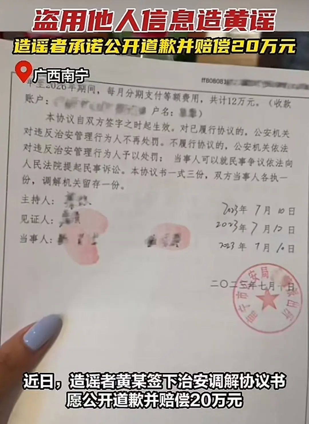 她發現後立馬報警,最終造謠者黃某必須公開道歉,並賠償20萬。