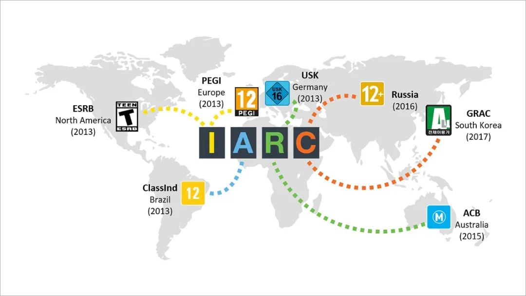 近年來,一個叫IARC(國際年齡分級聯盟)的東西慢慢流行起來,它由北美、歐洲、巴西的評級機構聯合發起,後來又吸收了澳大利亞、俄羅斯、韓國等地區的評級機構參與進來,旨在整合、簡化不同地區的評級流程。開發者填寫一次問卷,就能同時拿到多個地區的數字發行評級,對小型數字遊戲還免費。這對小團隊簡直是天大的好消息。不過嘛,IARC暫時只管數字商店,主機平台和實體店的ESRB評級,依然一個也少不了。