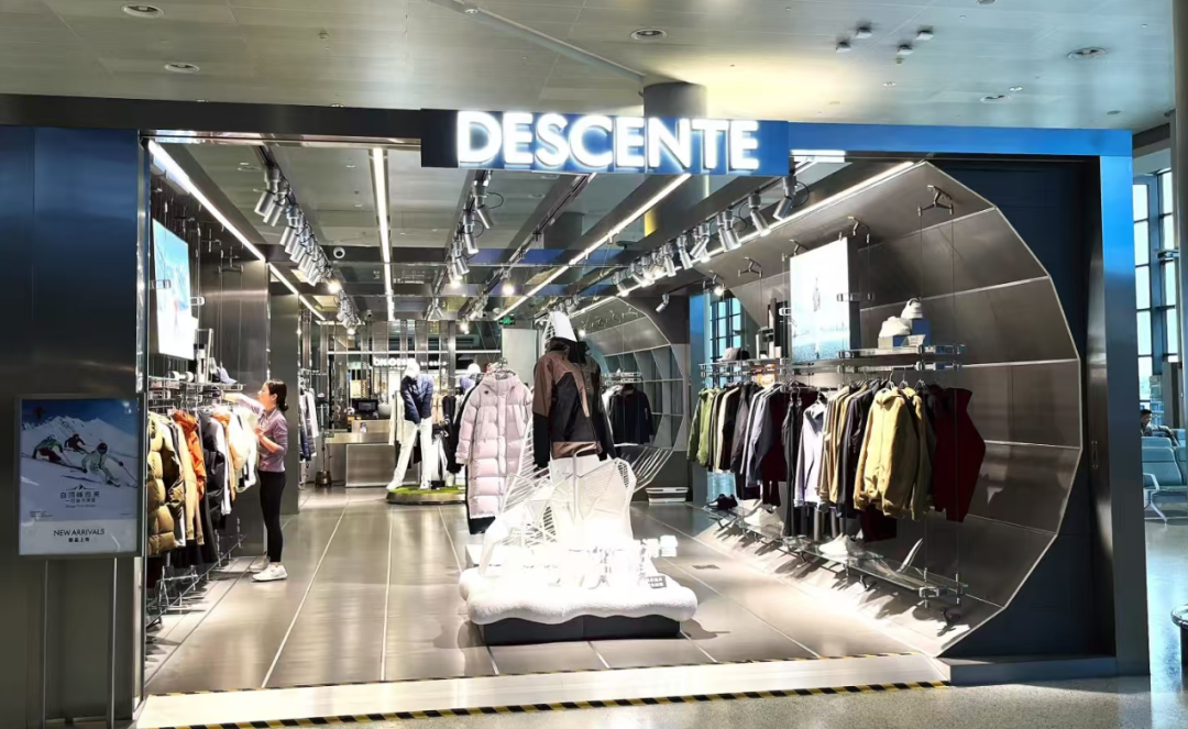 迪桑特在虹橋機場設置“商務運動艙”,陳列着可機洗羊毛西裝與彈力運動褲的組合套裝。