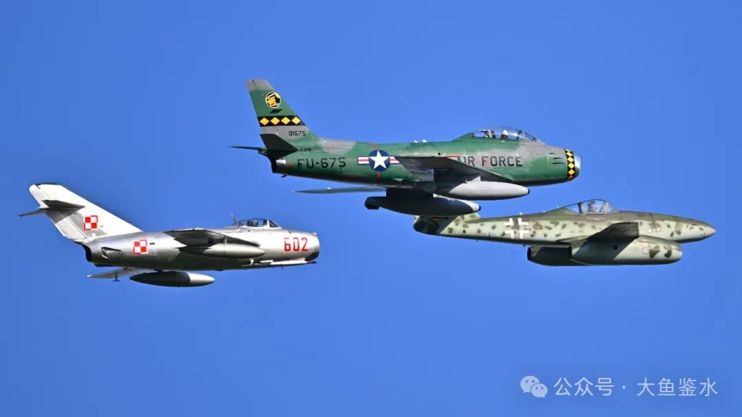 > 2023年9月10日法國巴黎-維拉羅什默倫航空展上罕見的Me262A、F-86、米格-15編隊飛行場景