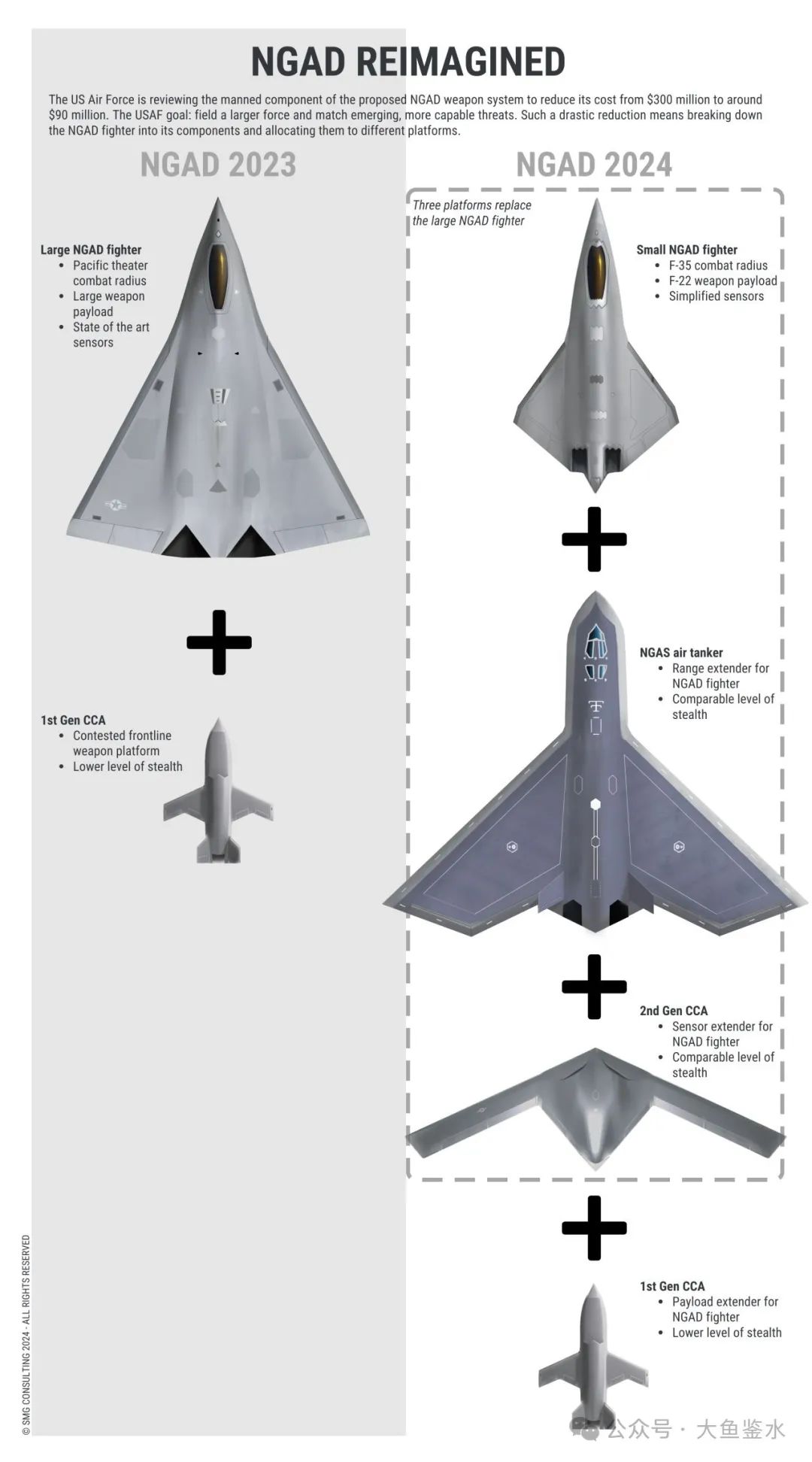 目前的消息是美國空軍希望把NGAD計劃繼續下去。去年提出的一個替代方案是用3個較小的平台替代原來的大型有人機,縮小後的NGAD有人機將具備F-35的作戰半徑和F-22的載彈量,傳感器也將簡化。另行研製一款隱身無人加油機為有人機拓展航程,其思路和海軍的黃貂魚類似,再加上高隱身性的第二代CCA作為NGAD的態勢感知平台。
