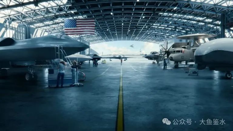 > 諾格製作的宣傳資料,機庫中停放的都是諾格設計製造的飛機,包括全球鷹、E-2C、B-2、X-47C,機庫外還飛着一架B-21,左側最前方似乎是它的NGAD方案之一