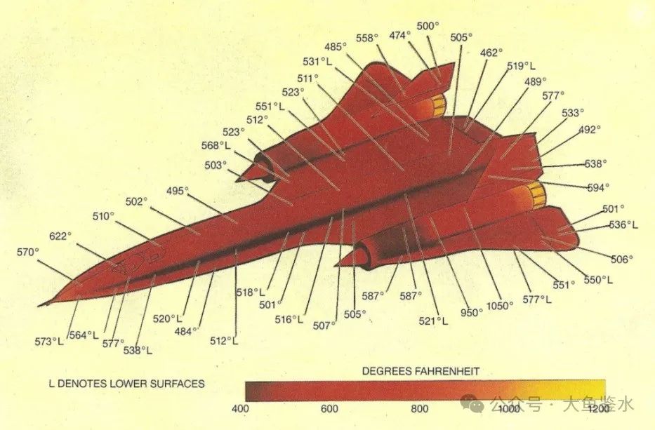> SR-71三馬赫時的熱量分佈,單位為華氏度