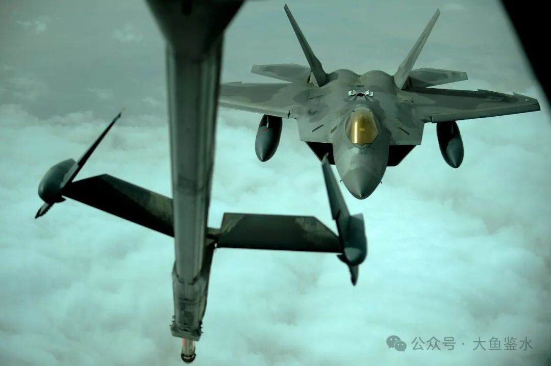 > 一架攜帶副油箱進行轉場飛行的F-22正在接受空中加油