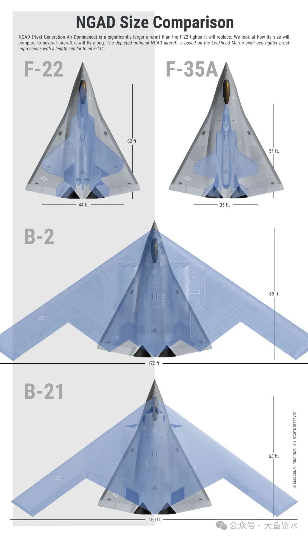 > NGAD和F-22、F-35、B-2及B-21的體積對比