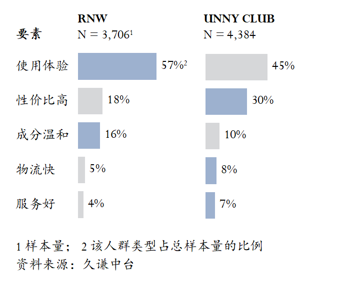 RNW的消費者更加關注清潔和保濕效果,特別是在黑頭去除、毛孔收縮和敏感肌適用性方面。其性價比高和成分温和性受到肯定。相比之下,UNNY CLUB的消費者則更看重持久妝效、遮瑕效果以及防曬性能。UNNY CLUB在性價比方面表現突出,且其物流速度和服務質量也得到好評。
