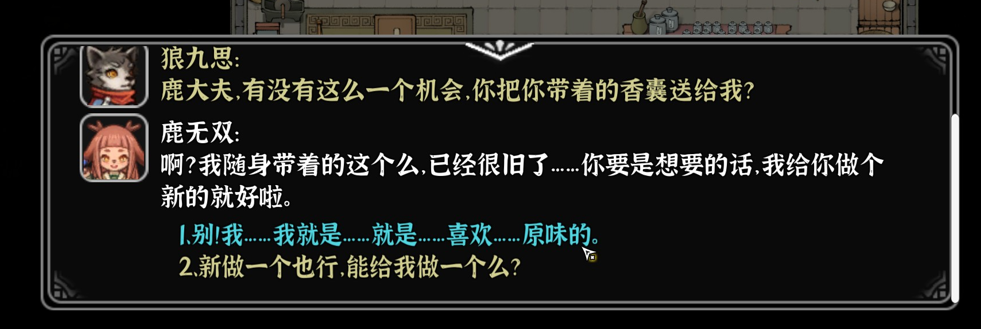 比如序章的女角色狼螢,如果主角選擇跟她發生親密關係,第二天她對主角的稱呼,就會非常熟練地變成“官人”,帶上一絲難以言喻的風塵氣。可如果沒有發生親密關係,她只會怯生生地稱呼主角為“公子”。