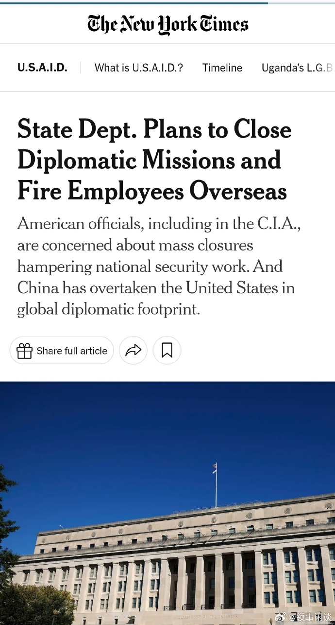 〔紐約時報〕包括中情局在內的美國官員擔心大規模關閉外交使團會妨礙國家安全工作,而中國的全球外交足跡已超過美國。