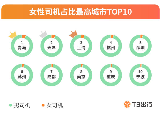 那麼,哪些城市的女性更青睞從事網約車司機這一職業?報告顯示,在T3出行160多個運營城市裏,青島、天津、上海三城的女司機數量佔比位居前三,杭州、深圳、蘇州、成都、南京、重慶、寧波緊隨其後,分列第四至第十名,一線、新一線城市女性從事靈活就業意願更強。