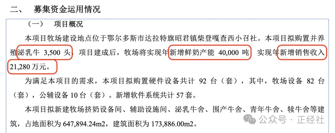 根據招股説明書(註冊稿)披露的信息,騎士乳業首發擬募集資金2.61億元,計劃用於奶牛養殖項目。該項目牧場建設地點位於鄂爾多斯市,擬購置養殖泌乳牛3500頭。項目建成後可實現年新增鮮奶產能40000噸,實現年新增銷售收入約2.13億元。