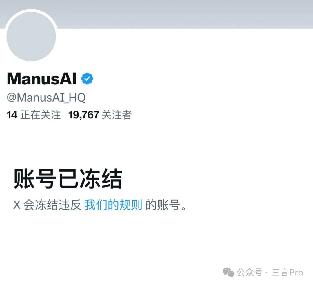 Manus在X平台的賬號被凍結,顯示違反了平台規則。