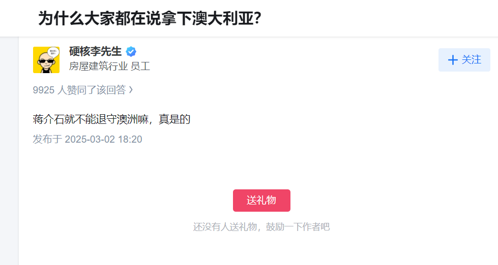 這個回答就更有意思了,直接説當年老蔣就不能退守澳大利亞嗎真是的