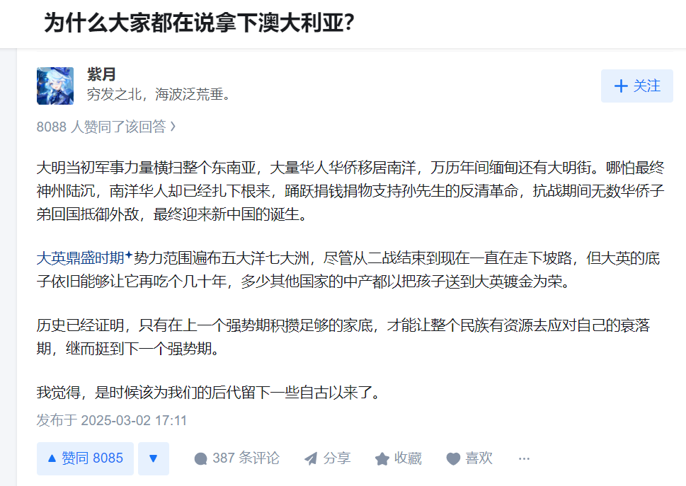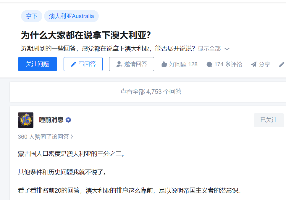 總之,排名前10,乃至前20的高贊回答,內容都差不多。概括一下,都是支持拿下澳大利亞。也可以説都是支持發動一場對外戰爭。