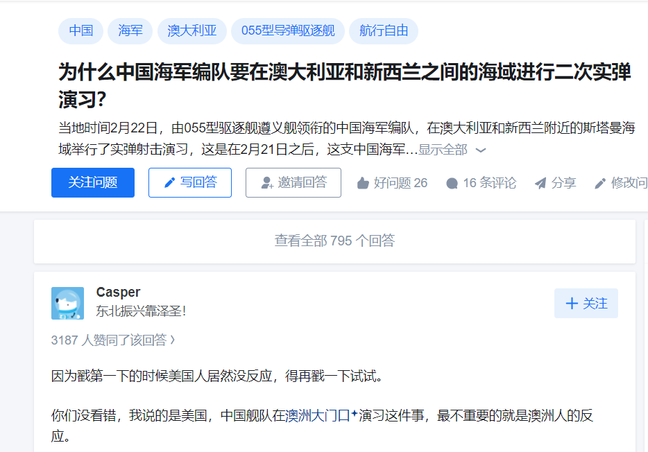 以前我老是説知乎在所有互聯網平台裏面,算是緩則最多,沒想到現在關於澳大利亞的話題之下,清一色都是鼓吹戰爭。