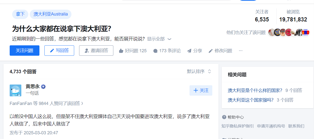 理解了這些背景,就能理解當前關於“拿下澳大利亞”會成為知乎熱門話題的原因。