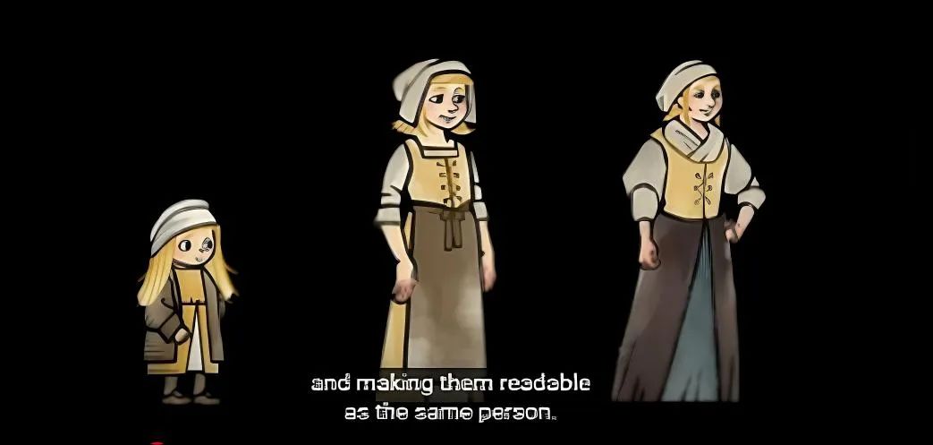 為了保證玩家能一眼認出處於不同年齡層的同一角色,團隊嘗試了很多美術風格。比如愛爾蘭奇幻電影《凱爾經的秘密》中人物身體部分的誇張化,衣服顏色和配飾等等。