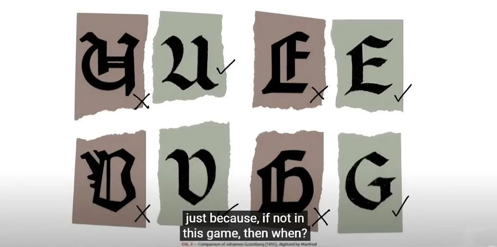作為一款背景放在中世紀的RPG,《隱跡漸現》根據不同角色的階層、身份和狀態設計了五種風格化字體(Stylized Fonts),開發團隊在這些字體的可讀性和準確性之間做了平衡的微調,特別是印刷體和抄寫體,讓大家看起來不那麼難以分辨——雖然就算如此,對非母語者來説,難度依然不小。