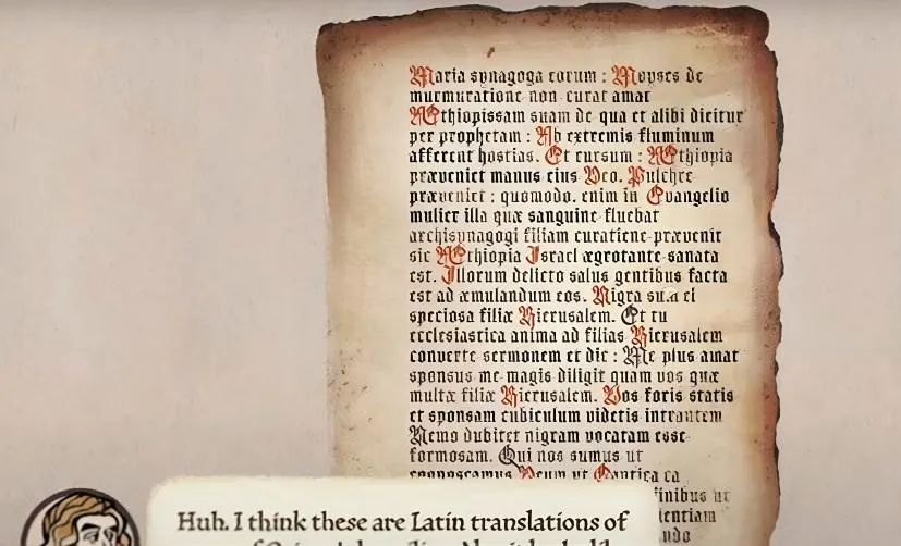 眾所周知,遊戲參考了翁貝託·艾柯的小説《玫瑰之名》,和小説裏一樣,遊戲也成功表現出一個主題:歷史小説和歷史專著,都是人手寫的產物,可能互為歪曲的拓本,也可能為一體兩面。