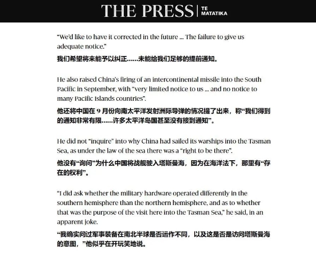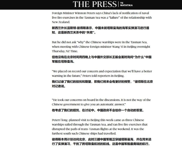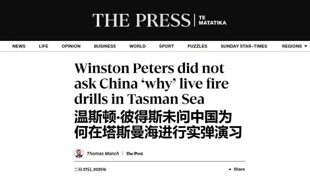 不知道是不是因為對彼得斯的這番表態心懷不滿的緣故,《新聞報》的記者托馬斯·曼奇(Thomas Manch)在撰寫有關報道時還用了一個酸不拉唧的新聞標題——《温斯頓·彼得斯並未就中國“為何”在塔斯曼海組織實彈演習的問題質問中國》(Winston Peters did not ask China ‘why’ live fire drills in Tasman Sea),那怨念大的我隔着屏幕都能感受得到。