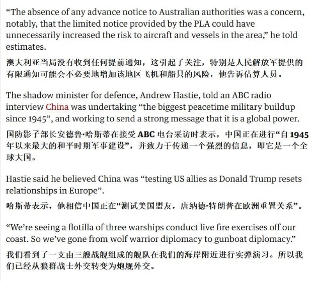不僅如此,哈斯蒂還説:“3艘中國軍艦出現在我國沿海附近,而且還組織了實彈演習,我認為此舉意義非同尋常,它標誌着中國對西方的外交風格已經從昔日的‘戰狼外交’升級成了‘炮艦外交’。”