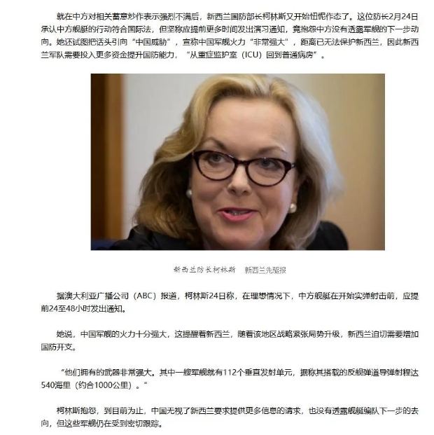 還是這個柯林斯,當時間來到今年2月下旬,也就是中國海軍在塔斯曼海舉行實彈演習的消息傳開之後,這老孃們對於我們行使航行自由的做法的評價,那味道就不太一樣了。柯林斯一方面承認我方艦隊的行動是符合國際法的,另一方面卻又忍不住對我們陰陽怪氣,煞有介事地説什麼“中方應該在更早之前向新方發出演習照會。派遣如此強大的戰艦抵達距離新西蘭之近的海域,卻不事先同新西蘭打個招呼,中方此舉實在是有失體面。”