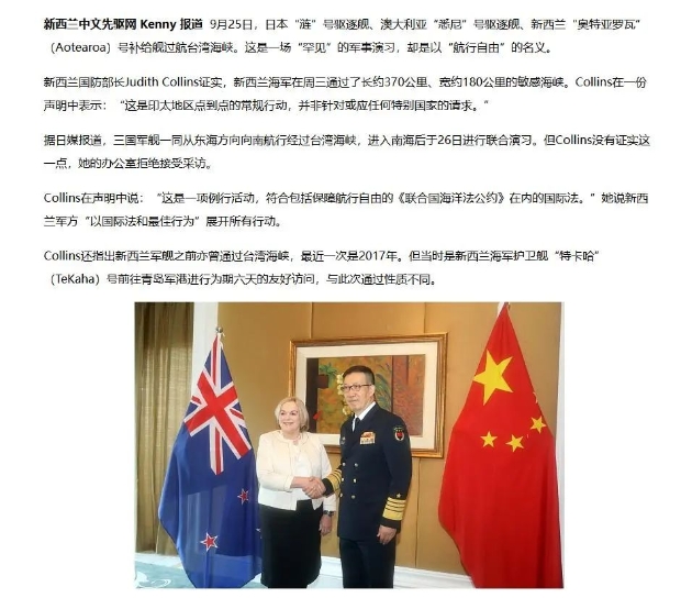 在當時穿越了台灣海峽之後,新西蘭防長柯林斯(Judith Collins)還出來假模假樣地發表了一份免責聲明,説什麼“這是印太地區點到點的常規行動,並非針對或應任何特別國家的請求,符合包括保障航行自由之基本權利的《聯合國海洋法公約》在內的國際法。”
