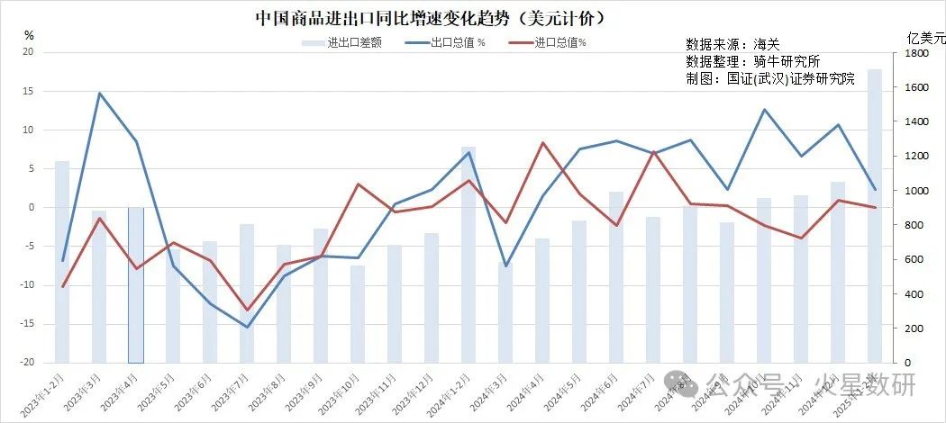 週五海關總署公佈的最新數據顯示,我國1月至2月期間的出口額為5399億美元,同比僅增長2.3%,遠低於市場預期的出口增長 5%,也大大低於2024 年12月出口增長10.7%,這是自2024年4月份以來最慢的出口增長。
