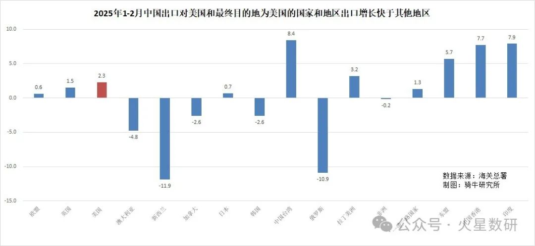 騎牛研究所提供的“1-2月中國出口對美國和最終目的地為美國的國家和地區出口增長快於其他地區”條形圖顯示,1月至2月,我們對傳統出口高增長地區的出口速度顯著回落,對俄羅斯出口下跌10.9%,對非洲出口下跌0.2%,對一帶一路國家出口增長1.3%,低於出口平均增速。