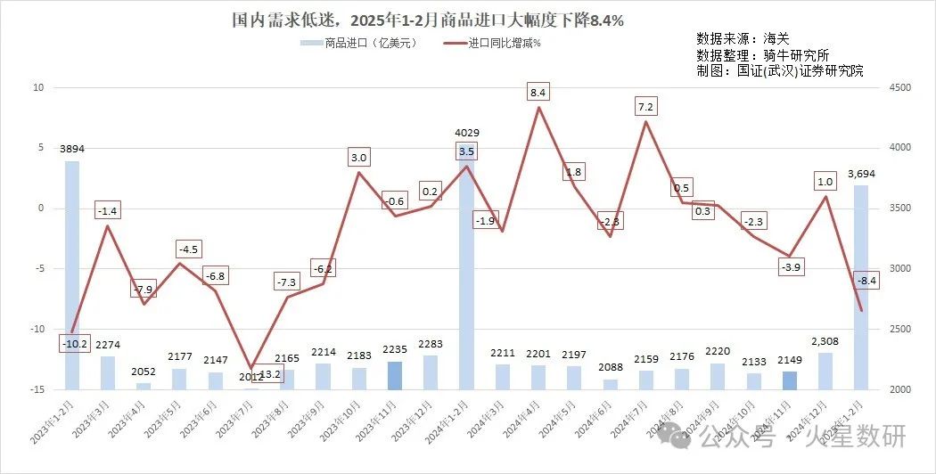 二是出口訂單預期下降。資源型產品進口暴跌表明,我們已開始縮減對關鍵大宗商品的購買,意味着預期的加工貿易出口訂單大幅下降。這可能是製造業正在為與特朗普即將於4月份實施的翻倍增加的關税所導致的可能至少持續四年的嚴峻貿易緊張局勢做準備。雖然美國對中國商品徵收更高關税的損害,最早可能會在下個月顯現。